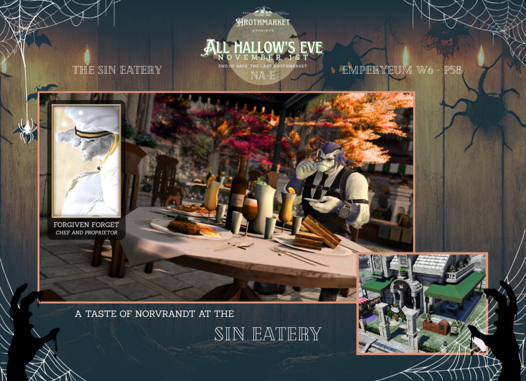 Join us at the Sin Eatery café for al fresco dining with recipes curated from the First itself, prepared by our very own (definitely not evil) Sin Eater, our Chef and Proprietor Forgiven Forget. It's your local stop in the Empeyreum for treats from Norvrandt!